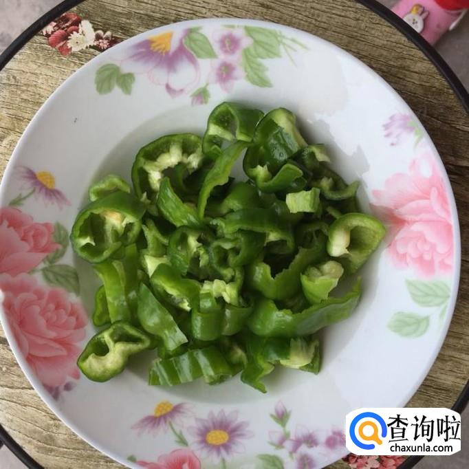 取两三个小青椒,将青椒去蒂去籽,洗净后,切成小块;