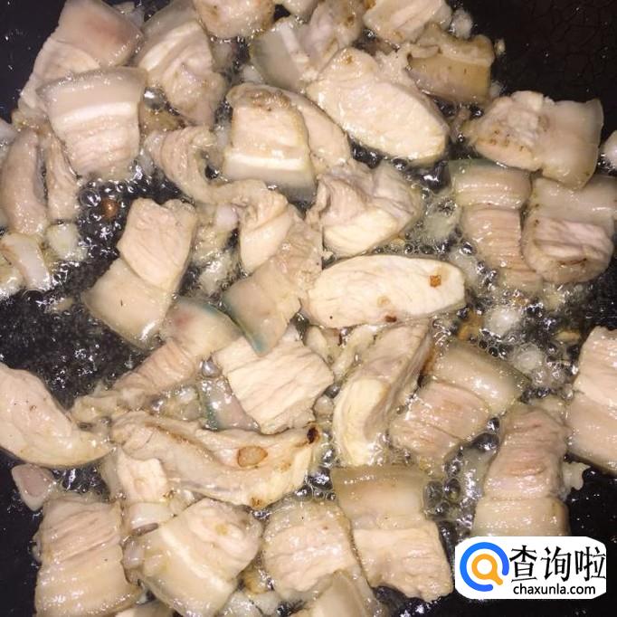 将五花肉下入锅里,翻炒至表面全部变为白色、再变为略显金黄色;