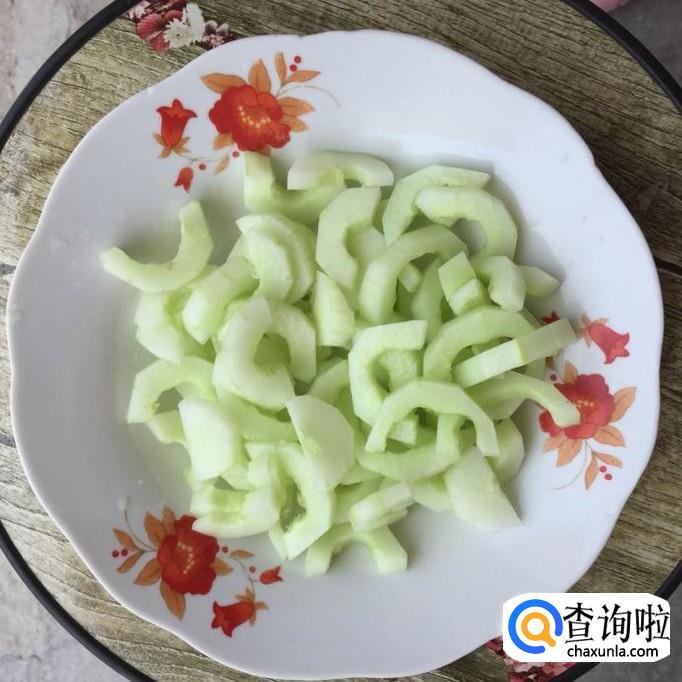 取一根秋黄瓜,将秋黄瓜的皮削掉,对半切开,然后去囊去籽,洗净,再切成小块;