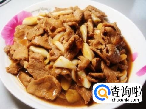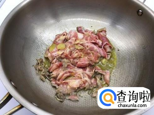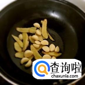 羊肉煎炒好了之后捞起来,然后在油锅里用中火将之前切好的蒜瓣和生姜煎炒,炒出蒜瓣的蒜香味之后倒入羊肉。