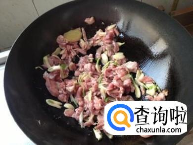这时把腌制好的羊肉放入油锅中煎炒10分钟左右,这时的羊肉大约有8分熟,注意煎炒羊肉时的火不要太大,中火就行。
