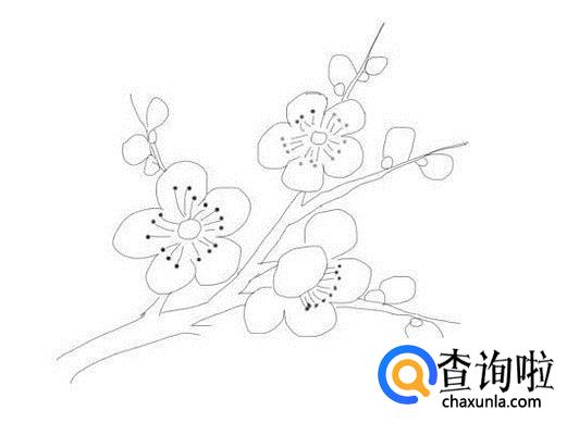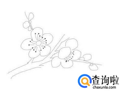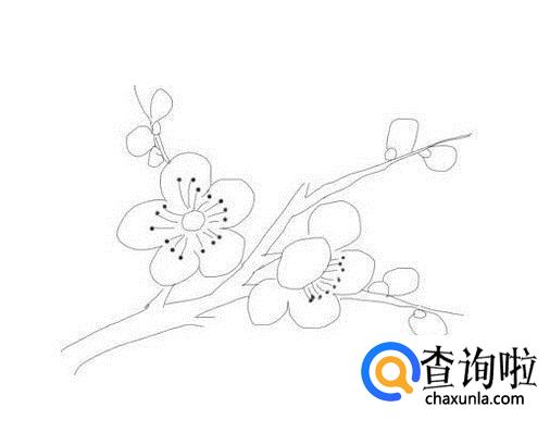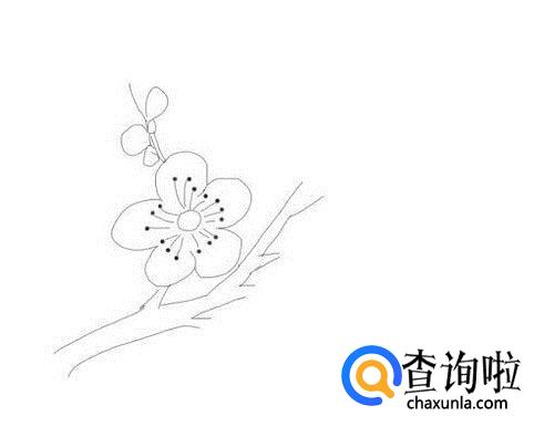 最后再画出一支分支杆,并在画出盛开的梅花和上面待开的梅花的花蕾,这样简笔画梅花就画好了,如图所示:
