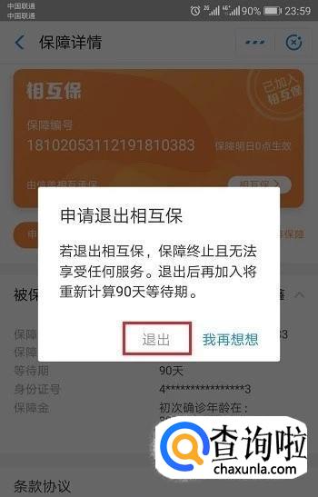 点击进去保障保障金界面之后,点击退出保障,会问及是否退出,点击【退出】就行啦。