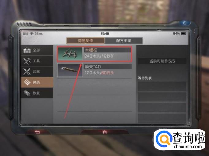 进入到【弹药】页面后选中木栅栏。