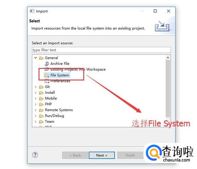 在弹出的Import界面中选择General下面的File System选项,如下图所示