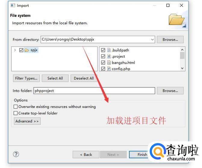 接下来需要将准备好的项目导入进来即可,如下图所示,注意项目下的文件都要勾选上