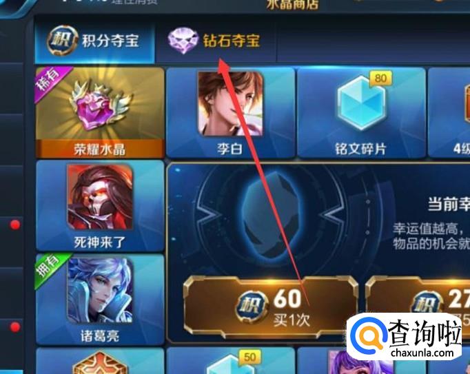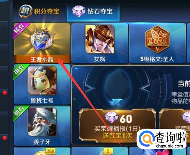 进入之后,通过钻石抽取王者水晶即可使用王者水晶兑换英雄韩信,如图所示。