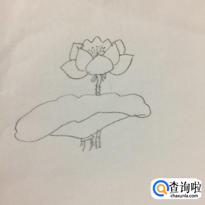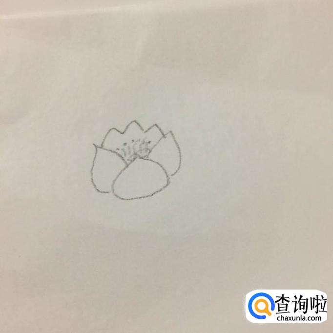 首先用铅笔在纸上画出一朵正在盛开的荷花,如下图所示。画这部分的时候可以把它想象成一个包子的形状,最后不要忘记在荷花当中画出花蕊。