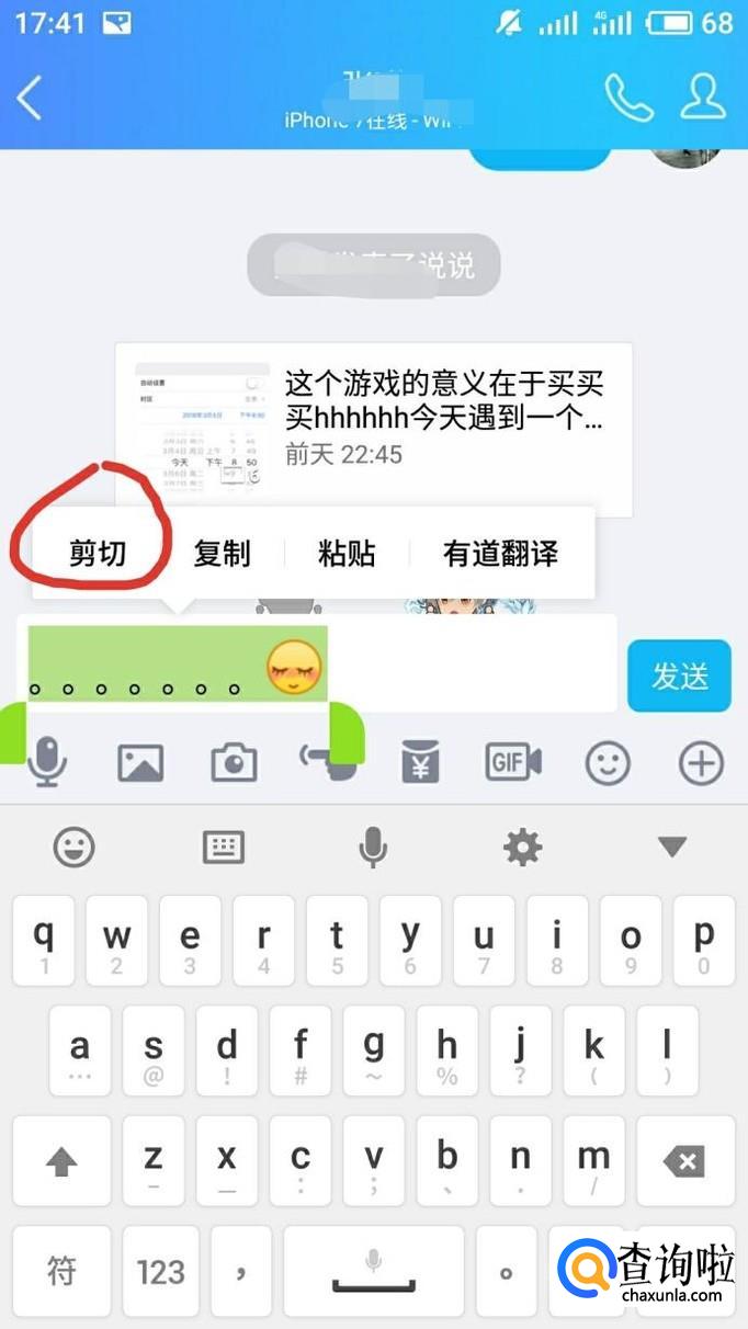 在聊天框中任意输入一段文字加入害羞表情必须是害羞才OK,然后剪切文字到红包口令。
