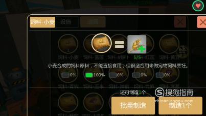 在工作台界面中,制作红马材料需要用到小麦饲料,辣椒饲料和优质肉块三种材料。首先我们来制作小麦饲料吧,5份小麦就能制作1份小麦饲料了。