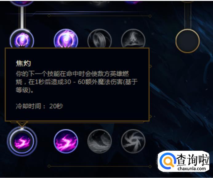 焦灼,焦灼可以在你的下一个技能命中时,使对方英雄燃烧在一秒后造成30点到60点的额外魔法伤害,这个技能这个可以理解为是一种固定的攻击力,在前期的时候比较适用,但是到了后期可以使用风暴聚集符文。