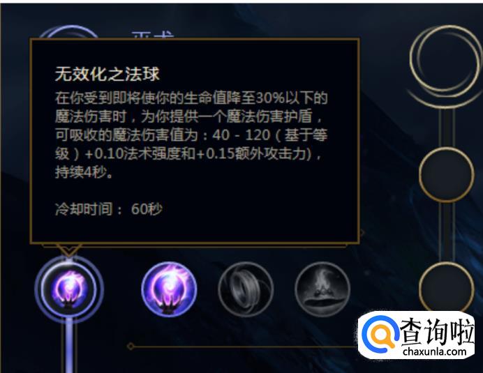 无效化之法球符文,这个符文可以在你受到伤害的时候为你提供一个魔法伤害护盾。并且还可以额外增加0.1的法术强度和0.15的额外攻击力,但是这个符文的冷却时间为60秒,比较适合对面的AP英雄多的情况。