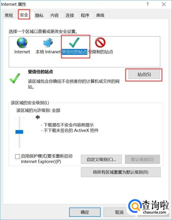 然后我们点击安全,之后我们点击受信任的站点,之后我们点击站点;