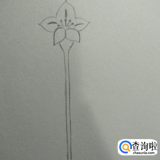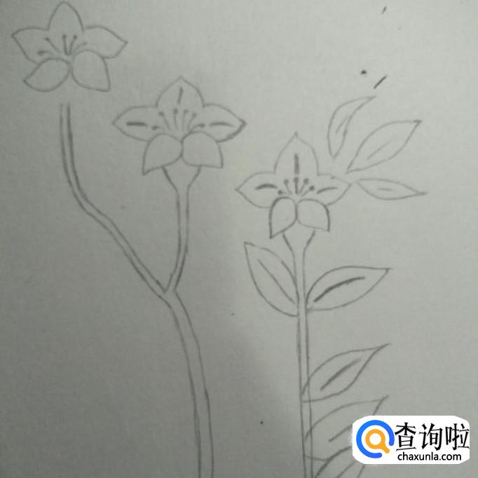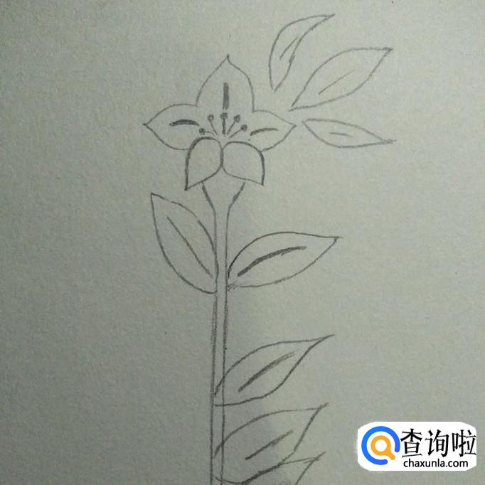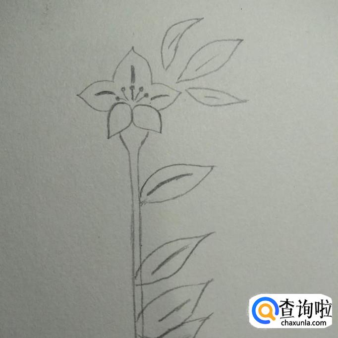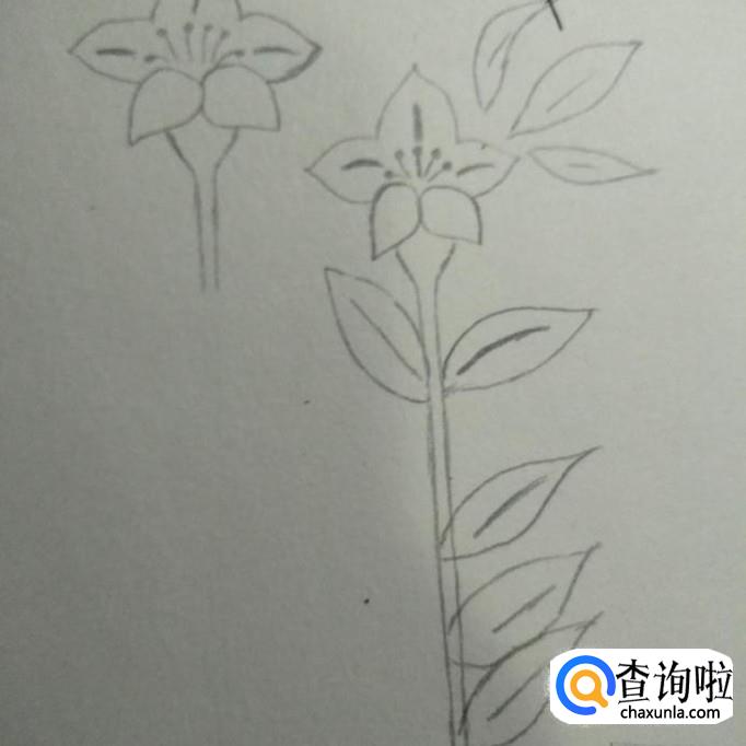 然后我们在花朵上方画出三片叶子,在花杆上画出几片叶子,如下图。