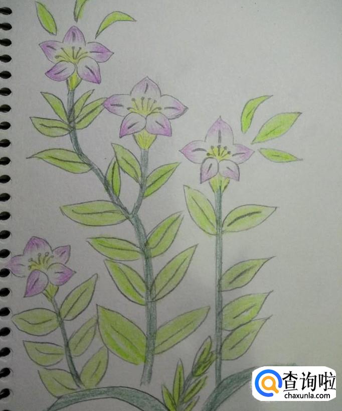 我们用蜡笔将花蕊涂成黄色,将花瓣涂成渐变的淡紫色,如下图,将花杆涂成深绿色,叶片涂成浅绿色,就OK了。