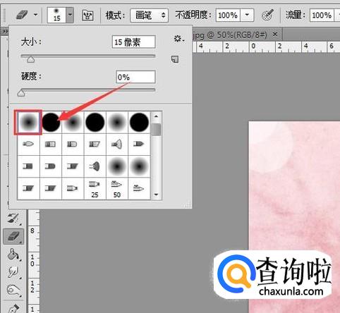 然后再在工具箱内找到橡皮擦工具,然后设置橡皮擦的参数和大小,如图所示:
