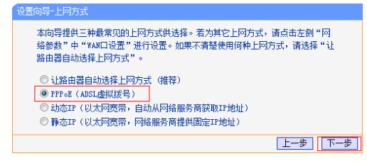 上网方式选择PPPoE(ADSL虚拟拨号),点击下一步。