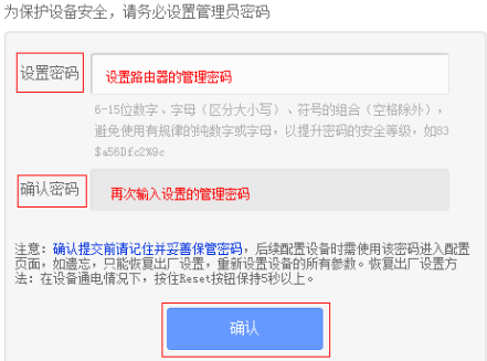 初次进入路由器管理界面,为了保障设备安全,需要设置管理路由器的密码,请根据界面提示进行设置。如下图: