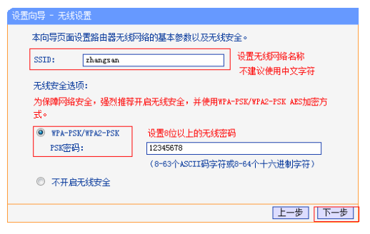 SSID即无线网络名称(可根据实际需求设置),选中WPA-PSK/WPA2-PSK并设置PSK无线密码,点击下一步。