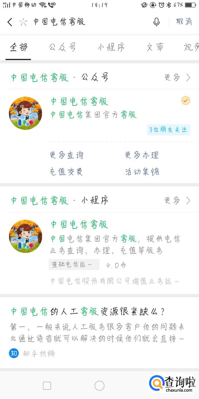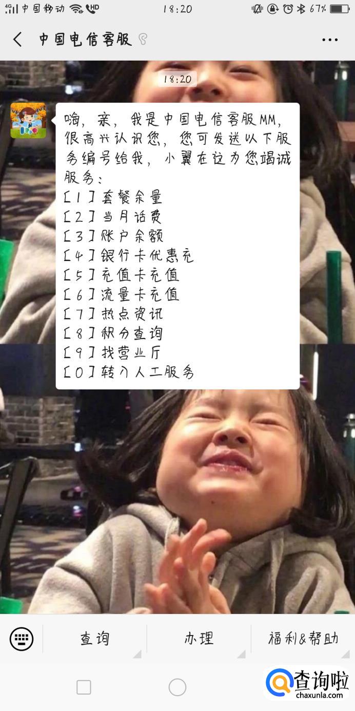 打开微信,搜索“中国电信客服微信”公众号,关注公众号之后,会自动发送快捷回复建,恢复自己想要办理的业务快捷键,然后根据提示操作,就可以了。