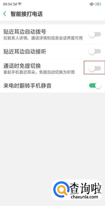 点击【通话时免提切换】右侧的按钮开启,绿色状态为开启。