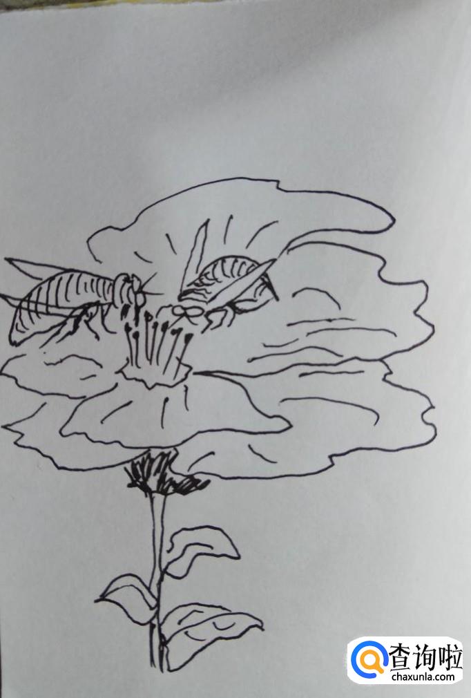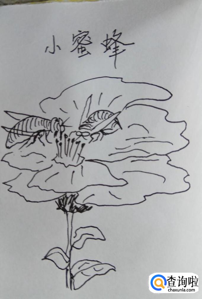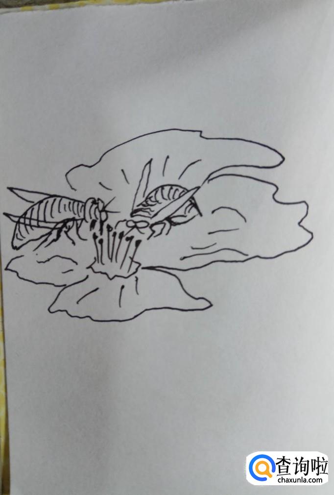 画出一朵盛开的花朵,重点画出花蕊部分,小蜜蜂采蜂蜜,主要是从花蕊中提取蜂蜜的。