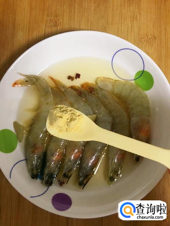 处理好的海虾放入盘中,依次倒入1小勺料酒和生姜粉,再放入几粒花椒,用手抓匀,静置2-3分钟。