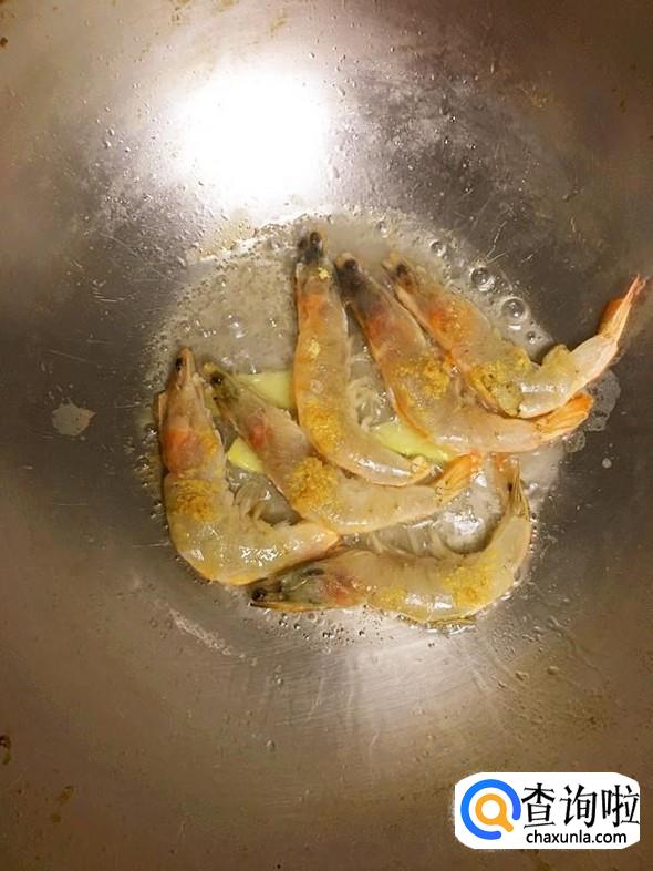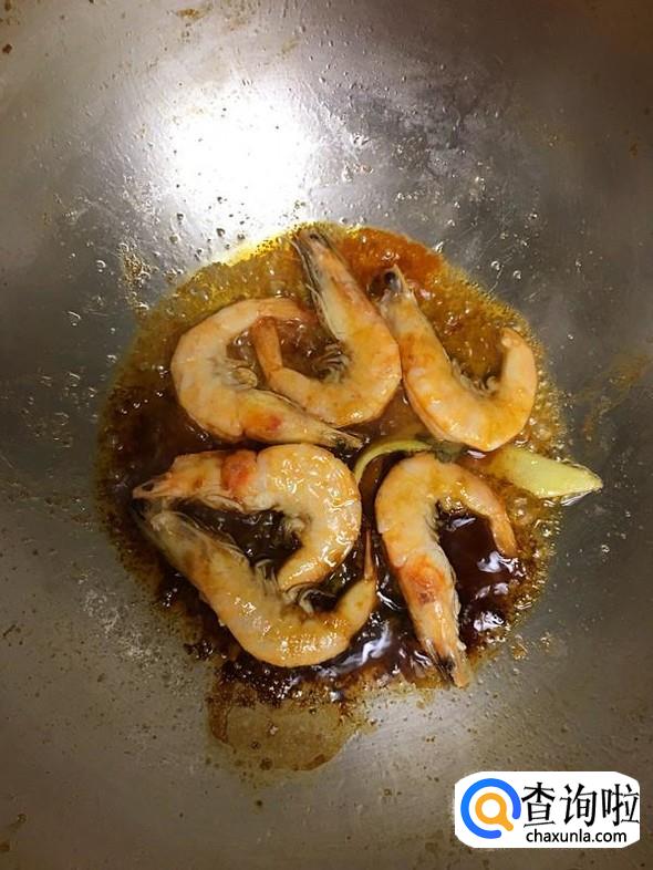 油锅烧热,把海虾捞出,放入油锅,大火翻炒。