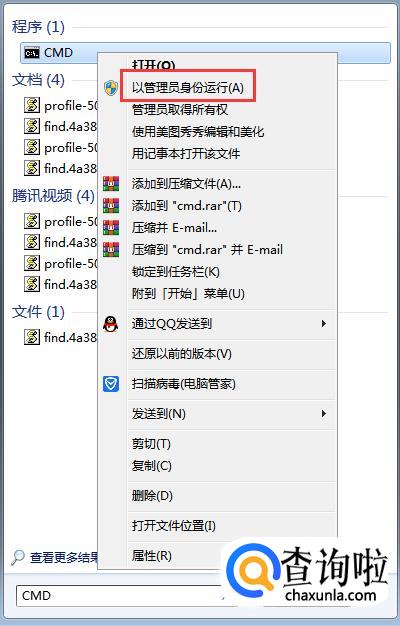 鼠标右键“cmd”,选择“以管理员身份运行”,如下图所示。