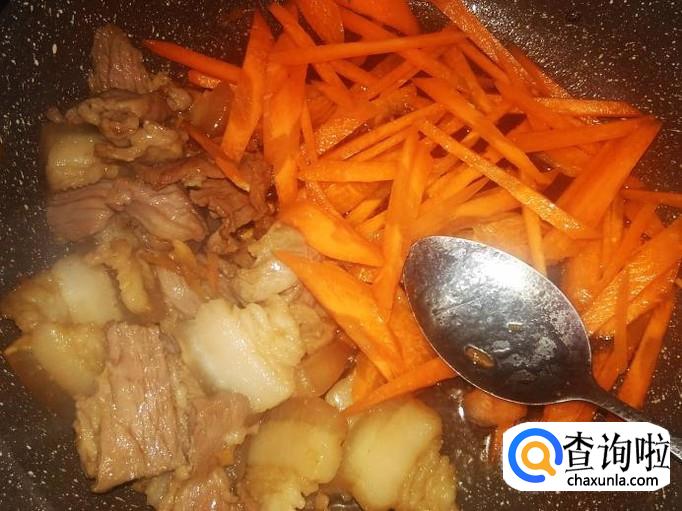 放红萝卜丝进去煸炒至软。【红萝卜不用放盐了,因为猪肉味料已经很浓】