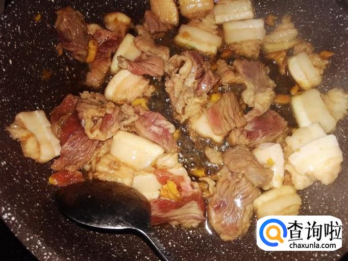 然后混合猪肉翻炒一下,盖上盖子焗1分钟左右。