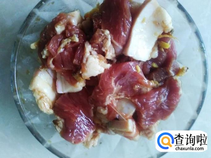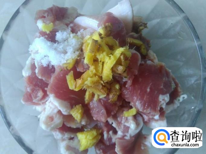 猪肉洗干净切成片,加适量的盐、姜蓉、1勺生抽、1勺料酒腌制几分钟。