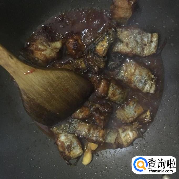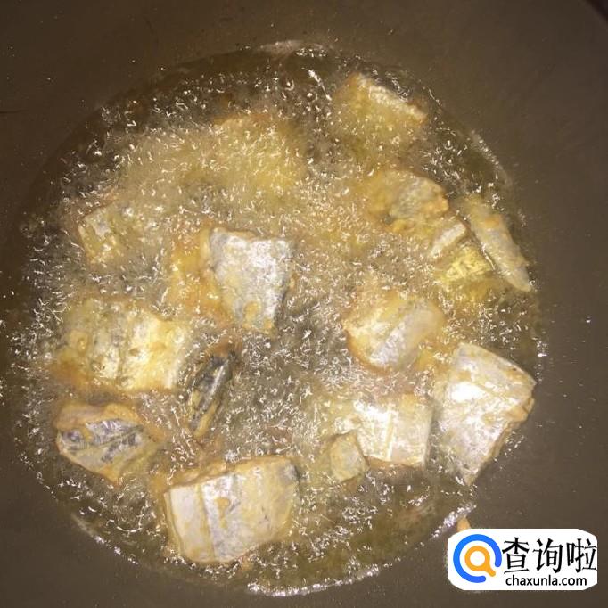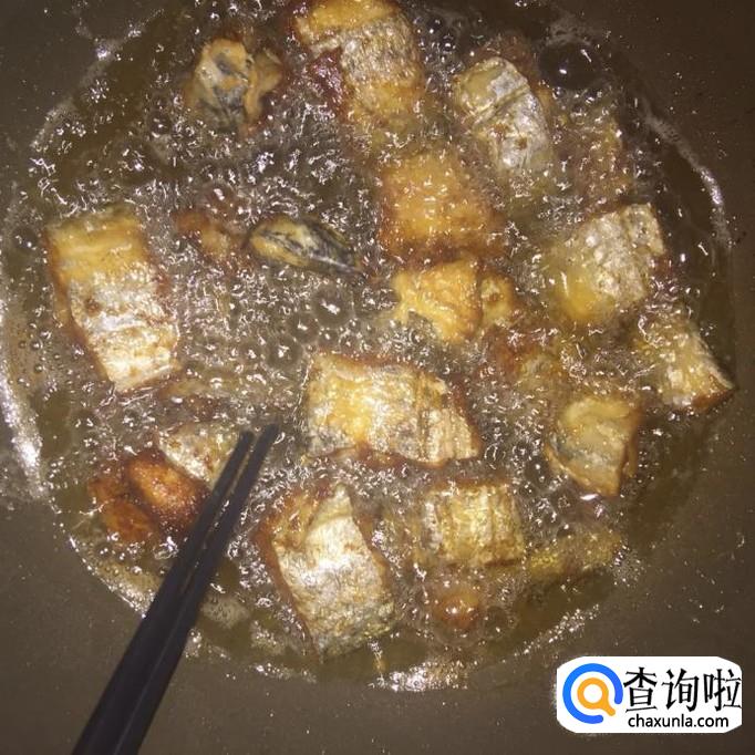 然后往锅中加入适量的食用油,待油烧至起泡,倒入带鱼炸五分钟。