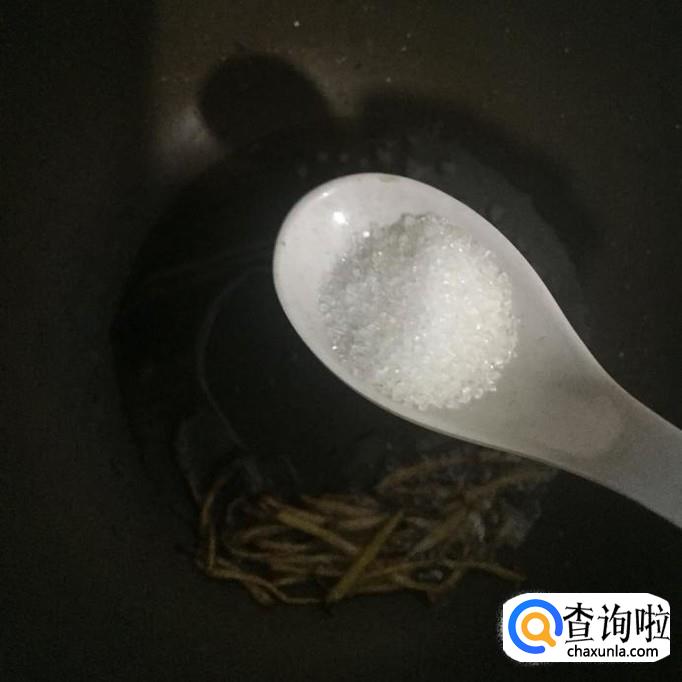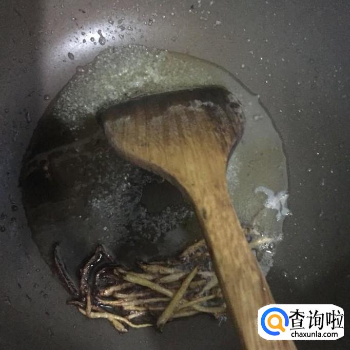 然后往过中加入两勺的白砂糖并用锅铲搅拌融化。