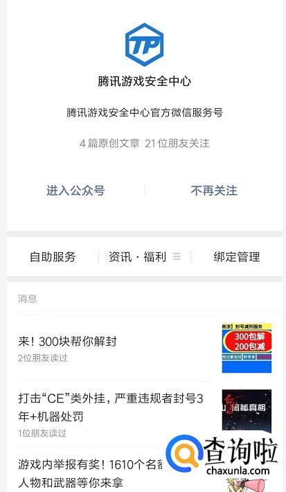 首先我们打开微信,搜索“腾讯游戏安全中心”,绑定被封的QQ号码。