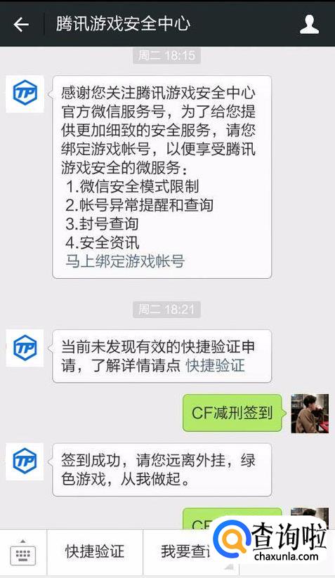 绑定后每天坚持给公众号发送【CF减刑签到】即可进行签到,满足一定条件后即可解封你的账号。