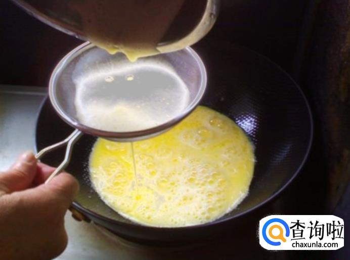 把锅从火上移开,过滤蛋黄糊倒入锅中。