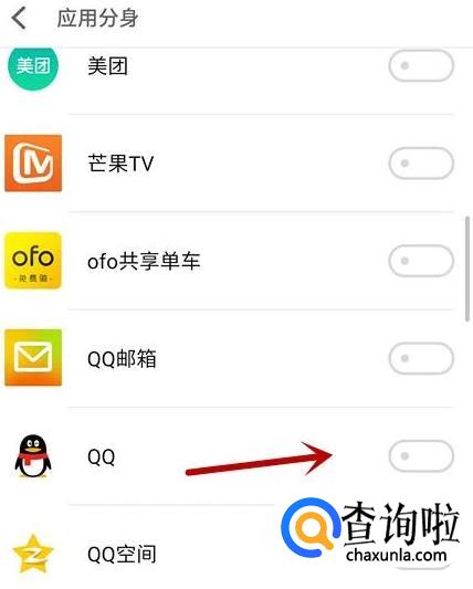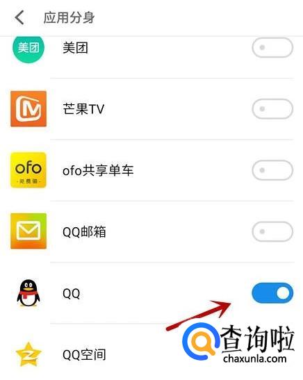 在应用分身中找到“QQ”,将右侧滑块开启。