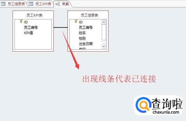 然后回到关系主界面,这个时候你就会看到两个数据表之间连接了一条线,这就代表这两个表之间已经建立了关系,如下图所示