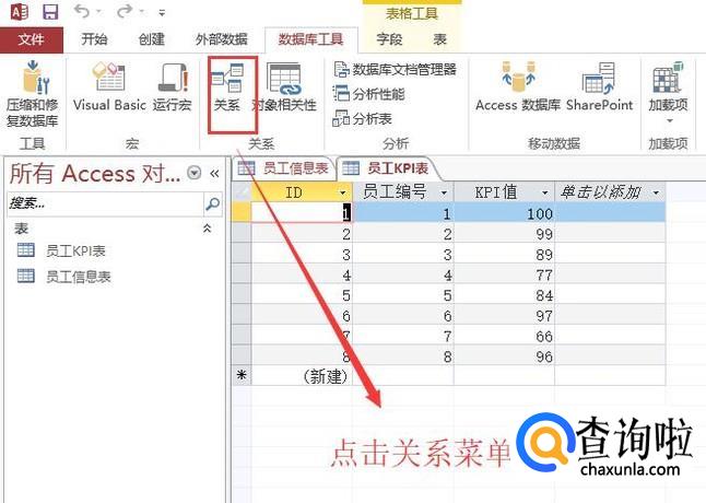 接下来点击Access顶部的数据库工具菜单,选择下面的关系选项,如下图所示