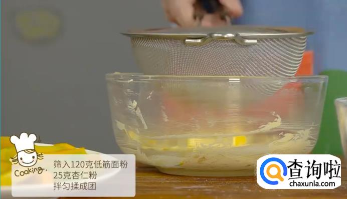 筛入120克低筋面粉和120克杏仁粉拌匀揉成团。