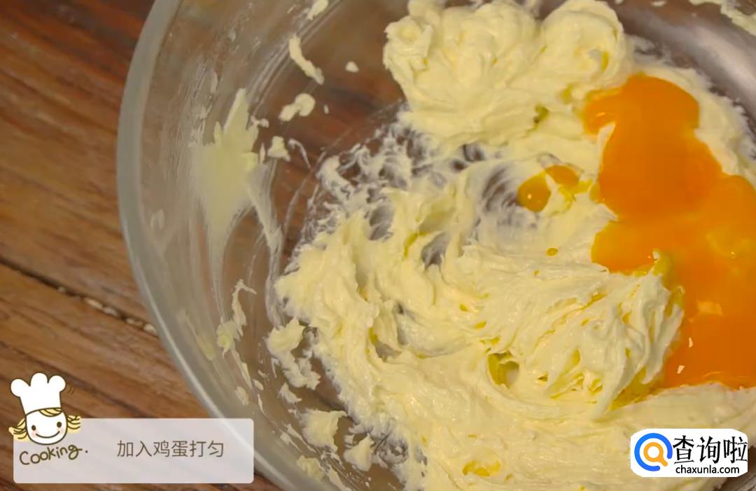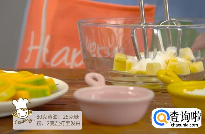 将软化好的黄油80克加入糖粉25克和盐2克打至发白。
