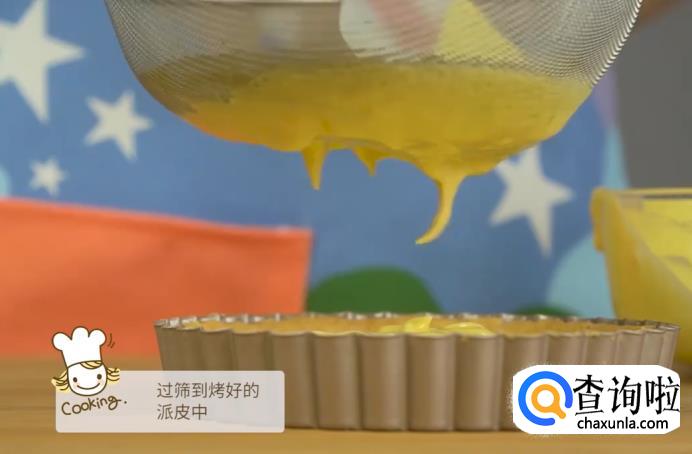 搅匀后,过筛入烤好的派皮中,9分满;送入预热好的烤箱170度烤20分钟左右出炉。