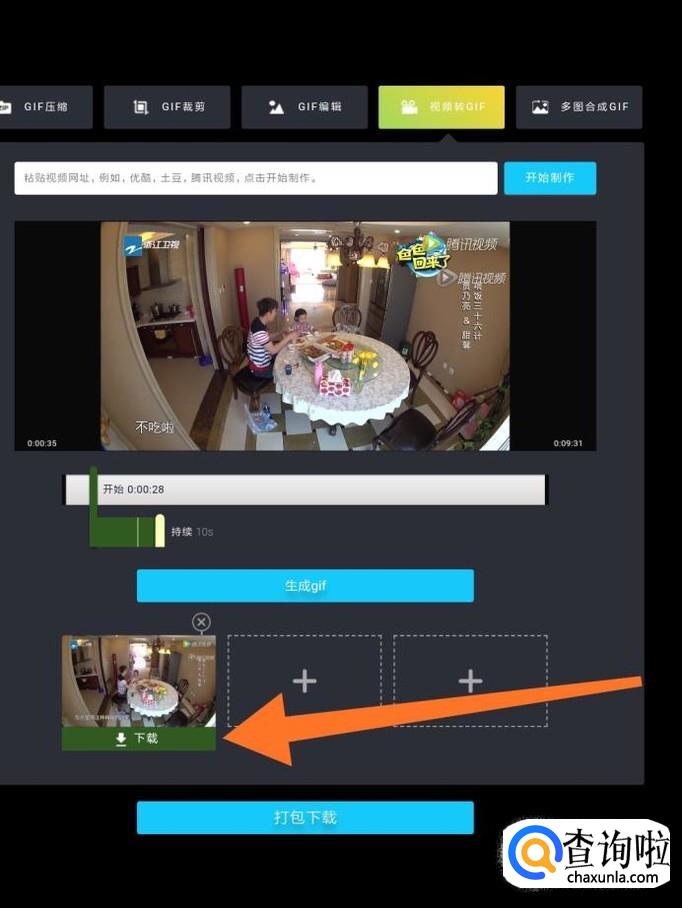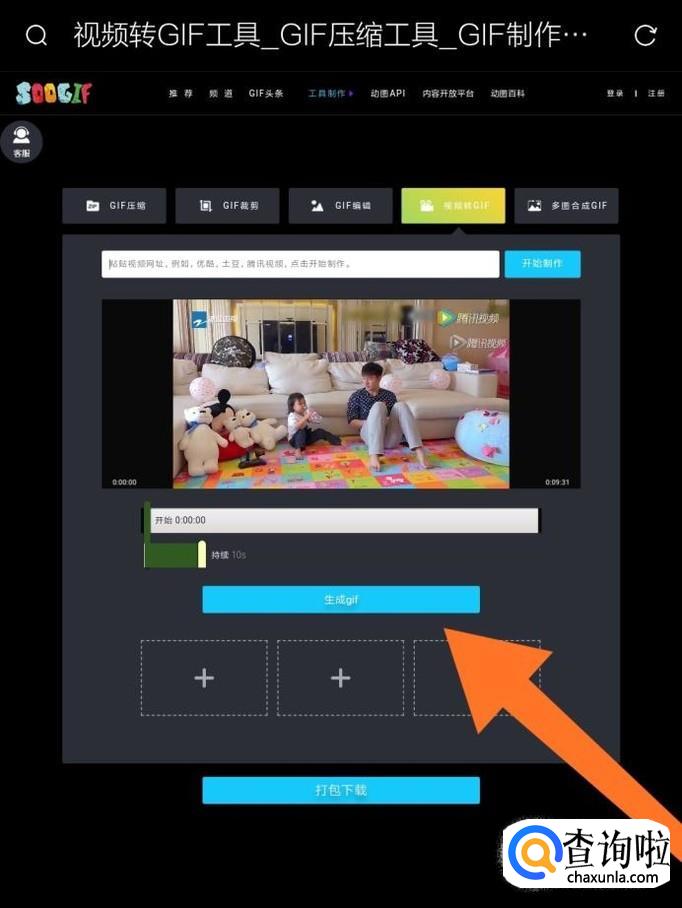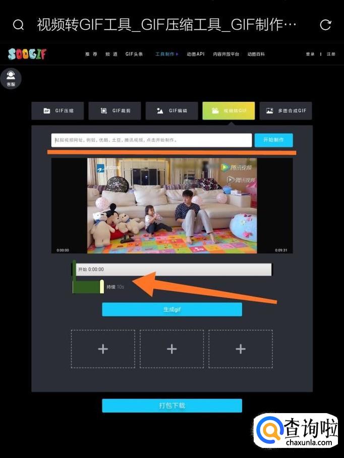 把需要制作成GIF文件的视频地址粘贴在方框内,然后点击“开始制作”。网页会自动播放视频,我们只需要拖动绿色的滑块来确定GIF动画开始的时间和持续的时间即可。