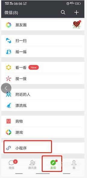 首先打开微信在下方栏目“发现”中,找到“小程序”点击进入!