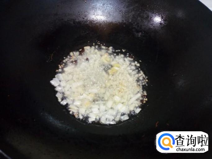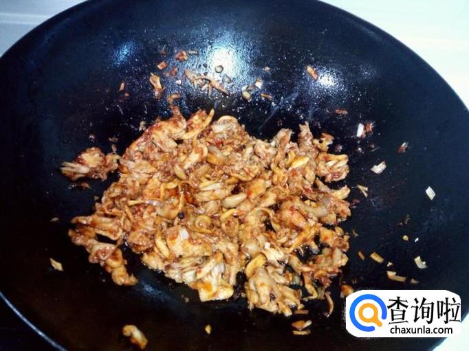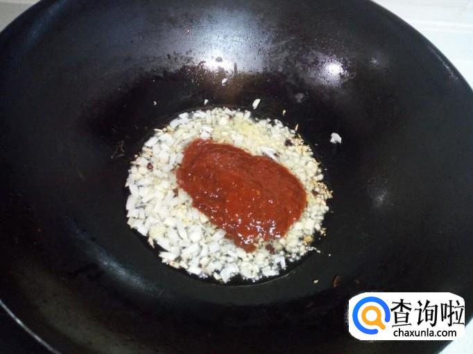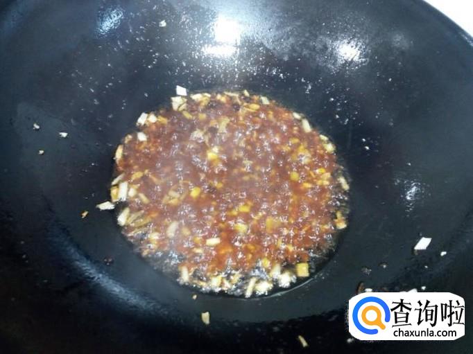 放入一大匙儿蒜蓉辣酱,料酒,少许白糖,翻炒成汁(不要放盐)。