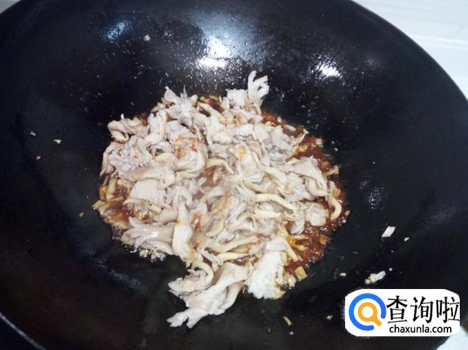 把攥干水分的鲜蘑倒入锅中翻炒。鲜蘑略翻炒即可,让鲜蘑都沾满酱汁,然后放入味精,关火出勺。