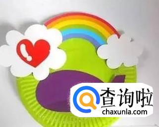 用透明胶水将彩虹和云朵粘贴在纸盘上,要记得在彩虹的两边都粘贴上云朵哦。