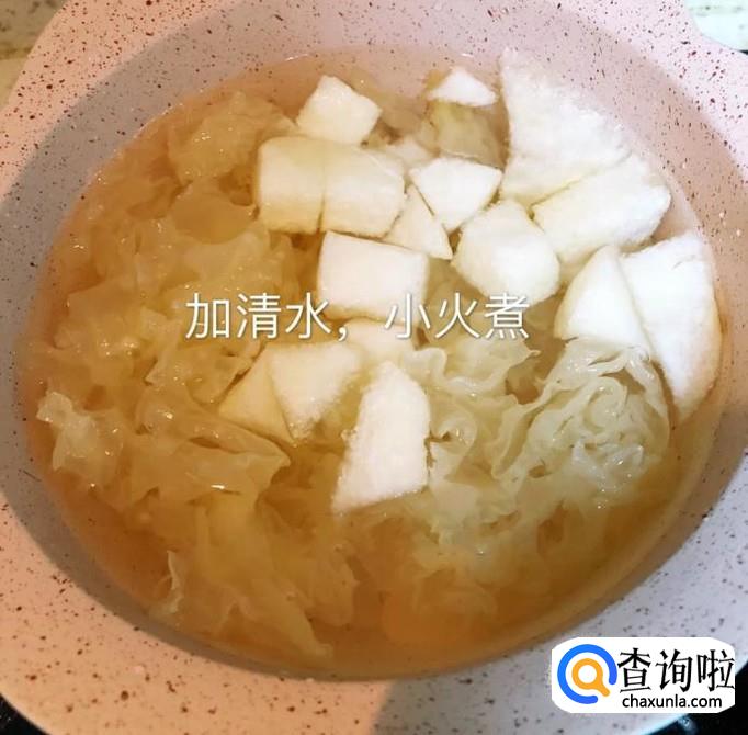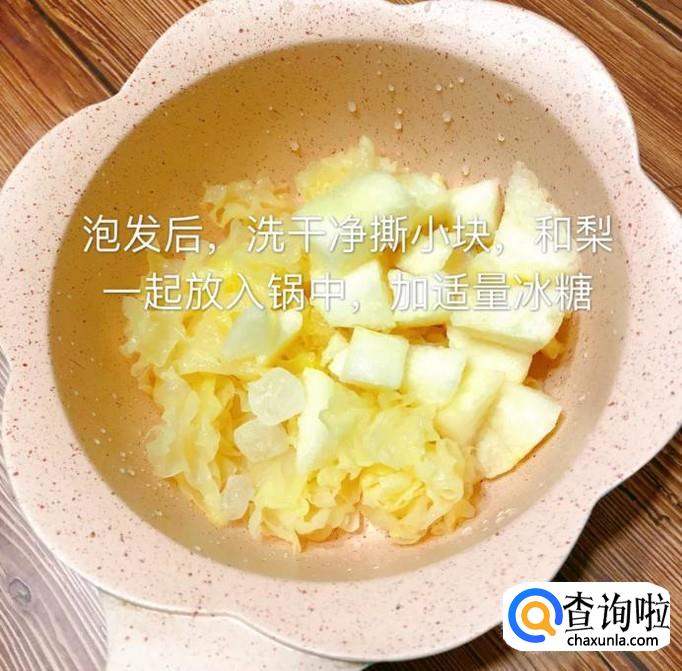 接着将泡发好的银耳洗干净,撕成小块,和梨一起放入锅中,加入适量的冰糖,如下图所示。