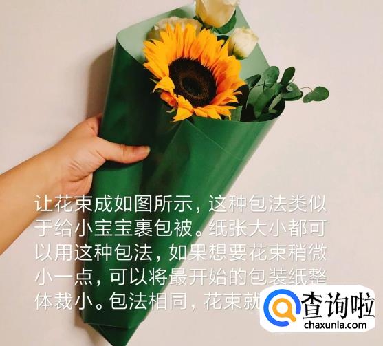 这种包法类似于小宝宝裹包被,纸张大小都可以用这种包法,如果想要花束稍微小一点,可以将最开始的包装纸整体裁小。包法相同,花束就会小一点。